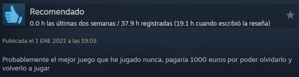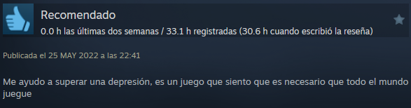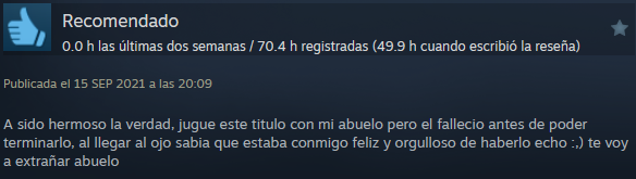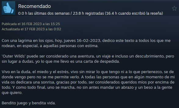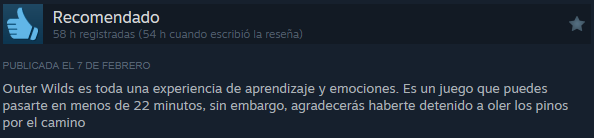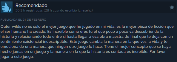 Este juego ni revolucionó el mundo de los videojuegos ni destacó entre otros. Pero Outer Wilds destaca por su gran impacto en los jugadores, mucha gente que ha vivido la experiencia del videojuego ha comentado que ha arreglado su vida, haciéndolos ver la realidad de las cosas. Este juego explora muchos aspectos de la vida excesivamente importantes los cuales no se le dan la relevancia que necesitan. Esta página está reservada para las grandes valoraciones de Outer Wilds, los comentarios positivos que la gente ha puesto en las reseñas de Steam y que merecen un reconocimiento para enseñar la valiosa comunidad que tiene.